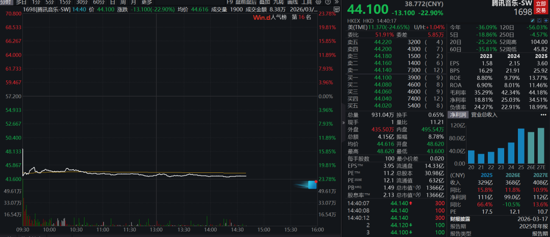半天大跌22.73% ,中午报收44.2港元。公布业绩后,腾讯音乐(01698.HK)3月18日大幅下跌。