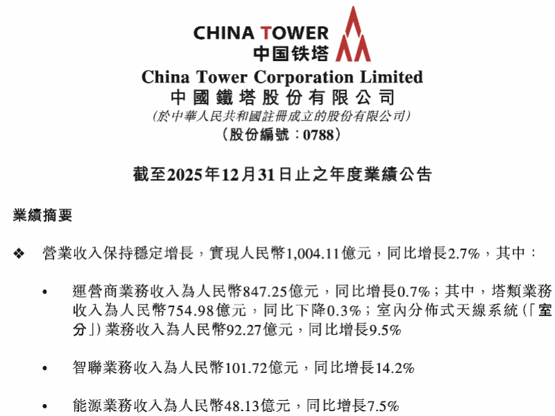 中国铁塔董事会建议派发2025年度末期股息为每股0.32539元(税前),连同已派发的中期股息,全年股息合计每股0.45789元(税前),全年可分配利润派息比率为77%。