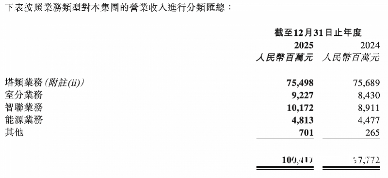 作为公司核心基本盘的运营商业务(一体业务),2025年保持平稳发展,全年实现收入人民币847.25亿元,同比增长0.7%。其中,塔类业务实现收入人民币754.98亿元,同比下降0.3%;截至2025年末,公司塔类站址数量达214.9万个,较上年新增5.5万个,运营商塔类租户达356.7万户,新增2.3万户,站均租户数为1.70户,资源共享效率持续提升。