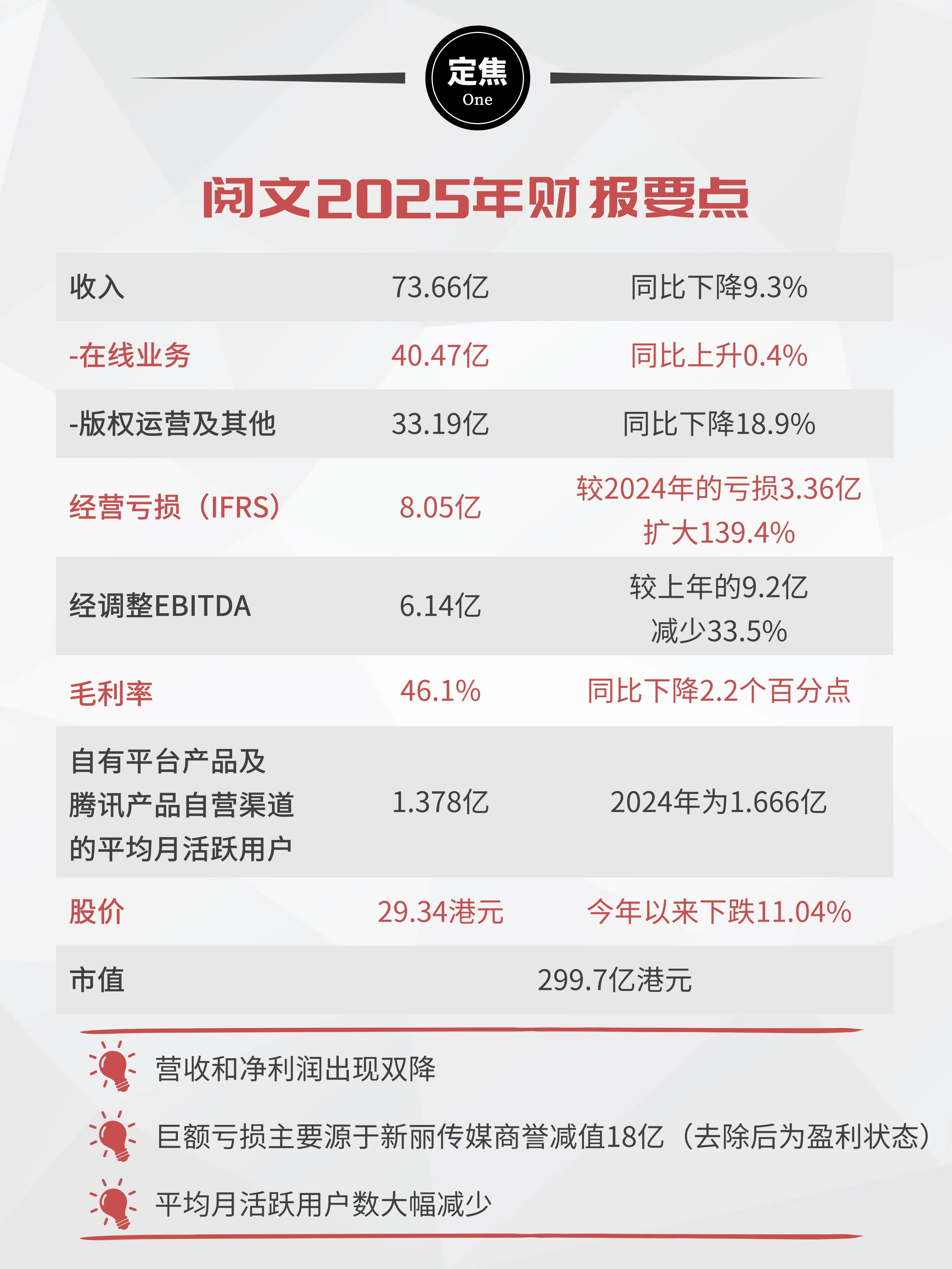 去年阅文营收73.66亿,同比减少近10%,经营亏损(IFRS)达到8.05亿,创下新高。主要问题出在新丽身上,报告期确认了一笔与新丽相关的18亿商誉减值,若剔除该影响,其经营利润为7.35亿。