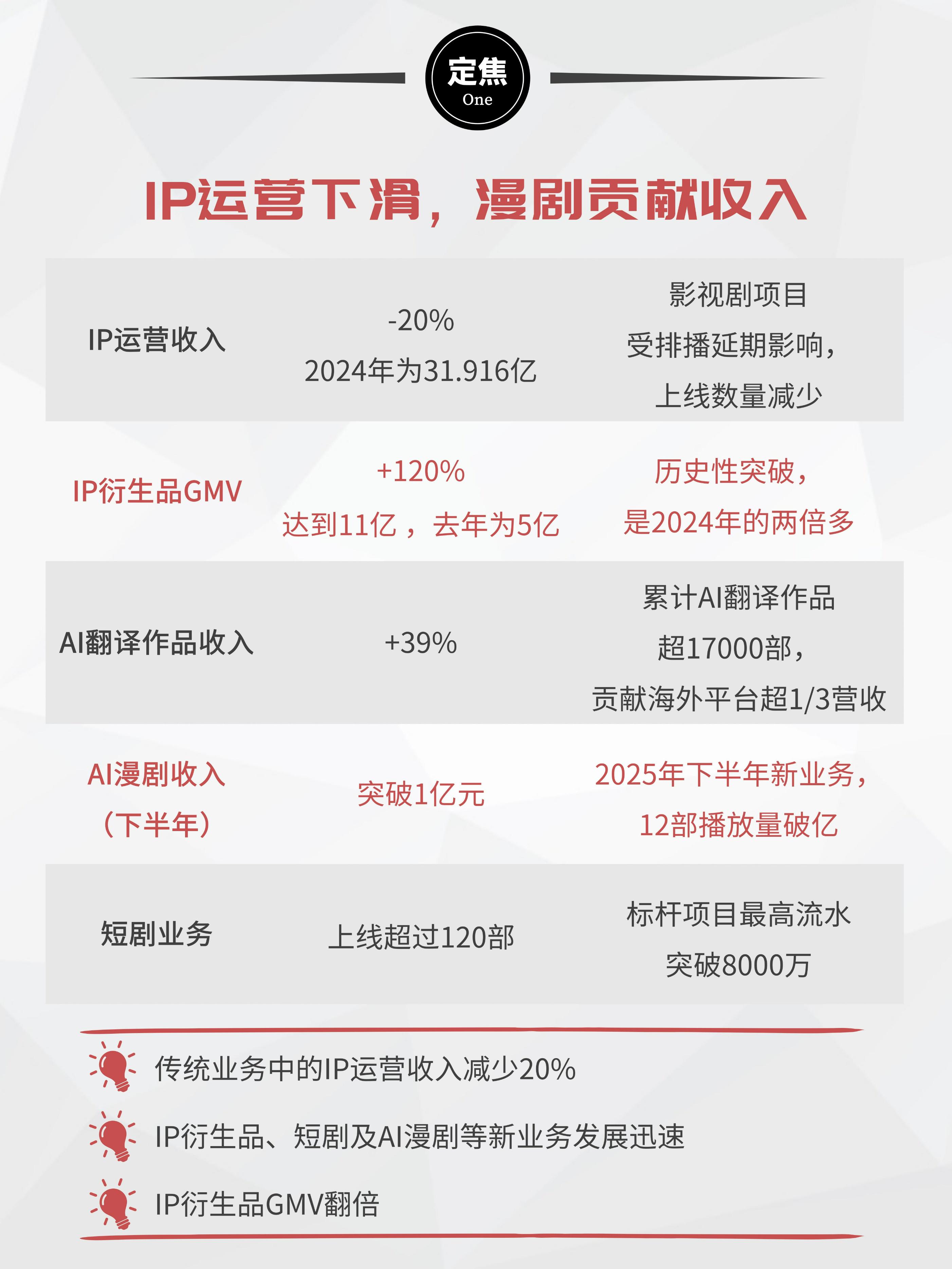 IP衍生品、短剧和AI漫剧都实现了迅速发展,特别是IP衍生品的GMV,是2024年的两倍多。尽管这些新业务目前收入基数仍较小,但已成为明确的增长亮点。