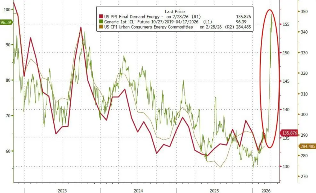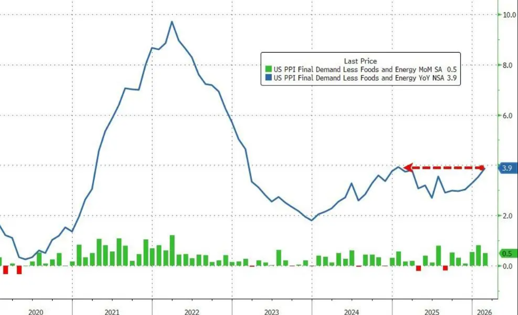 核心PPI(剔除食品和能源)同比上涨3.9%,高于预期的3.7%及前值3.6%;环比上涨0.5%,同样超出预期的0.3%,前值为0.8%,双双创2025年1月以来最高纪录。