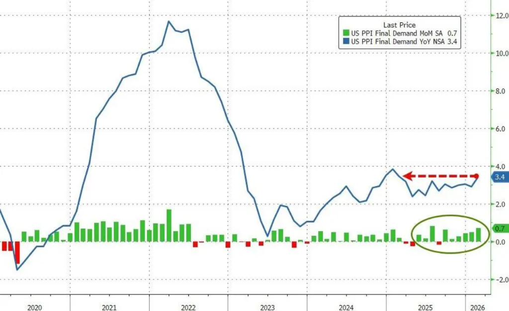 美国劳工部公布周三的数据显示,2月PPI同比上涨3.4%,高于市场预期的3.0%,较前值2.9%明显加速;环比上涨0.7%,为2025年7月以来最大单月涨幅,大幅超出预期的0.3%,前值为0.5%。