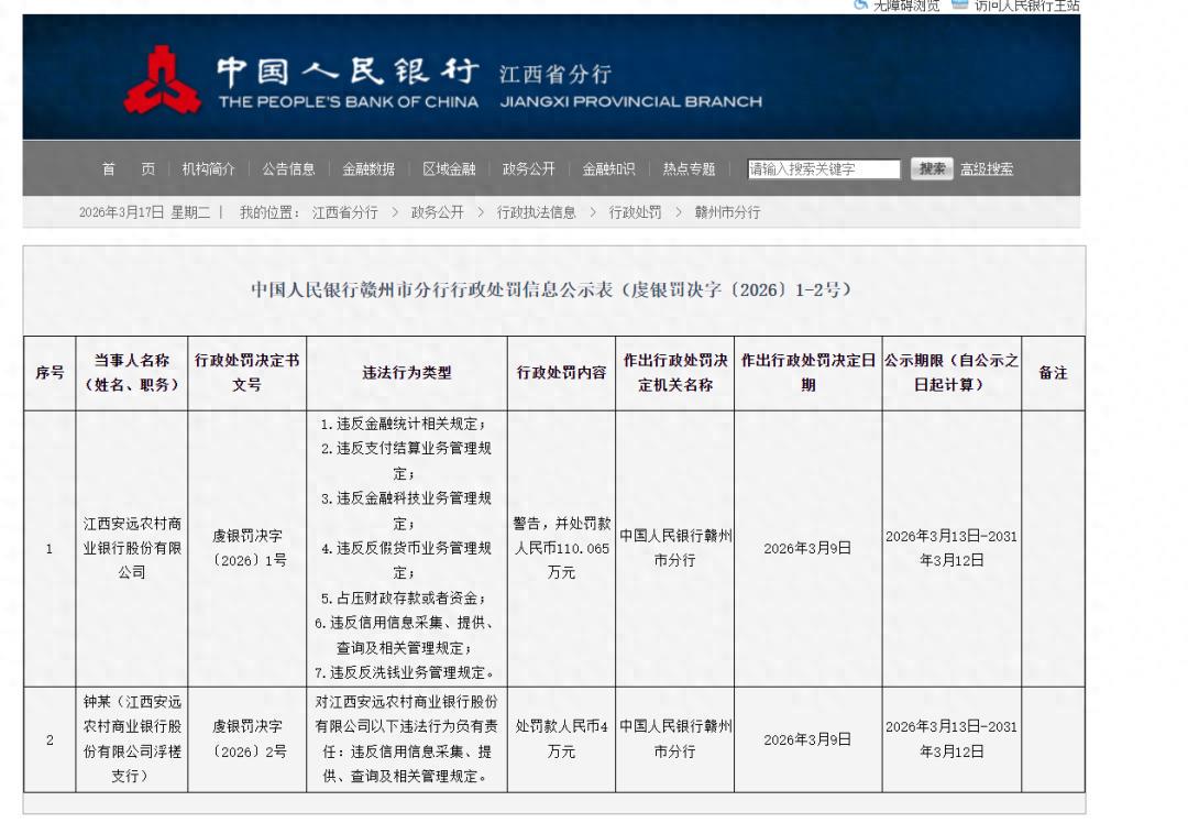 鉴于此,中国人民银行赣州市分行决定对其予以警告,并处罚款人民币110.065万元。此处罚决定于2026年3月9日作出,处罚执行期限为2026年3月13日至2031年3月12日。
