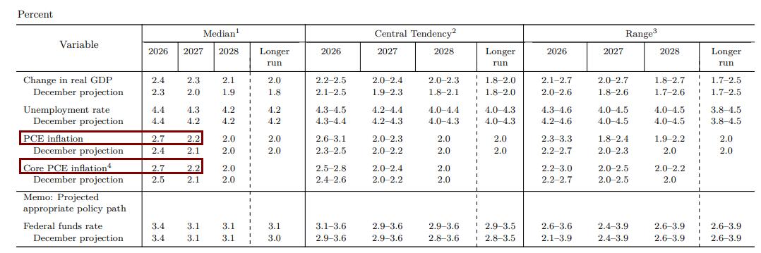 2026年GDP增速预计为2.4%,2025年12月预计为2.3%,2027年预期增速2.3%,12月预期2.0%,2028年预计增速2.1%,12月预期1.9%,更长期预期增速为2.0%,12月预期1.8%。2026年的失业率预期为4.4%,持平12月预期,2027年的预期为4.3%,12月预期为4.2%,2028年和更长期的失业率预期均为4.2%,均持平12月预期。2026年PCE通胀率预期为2.7%,12月预期为2.4%,2027年增速预期为2.2%,12月预期为2.1%,2028年和更长期的预期均为2.0%,均持平12月预期。2026年核心PCE预期为2.7%,12月预期2.5%,2027年预期为2.2%,12月预期为2.1%,2028年预计为2.0%,持平12月预期。