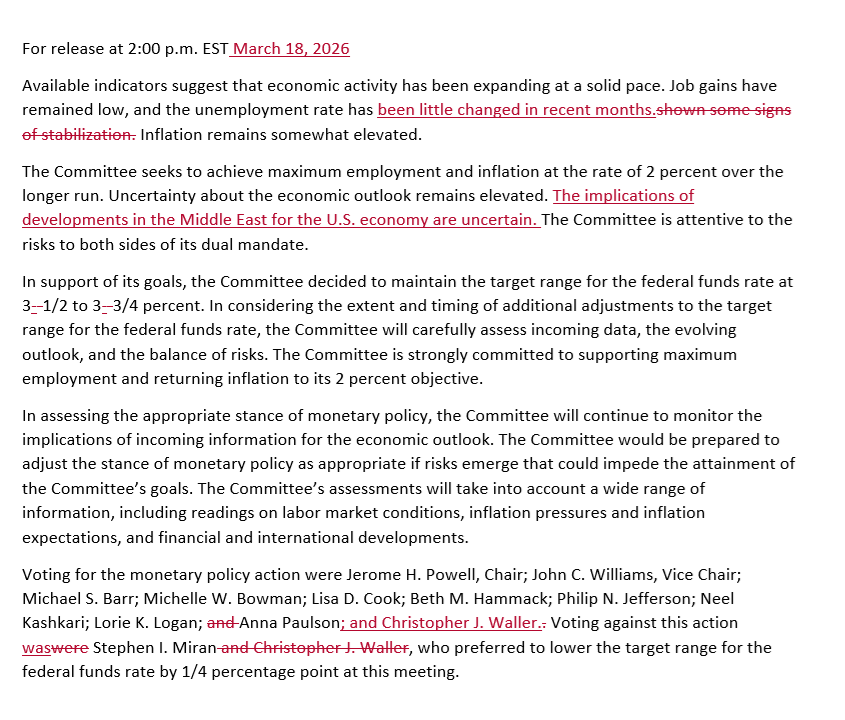 相比1月末的上次会议,本次会议声明最大的差异是新增了一句有关中东局势的表述: