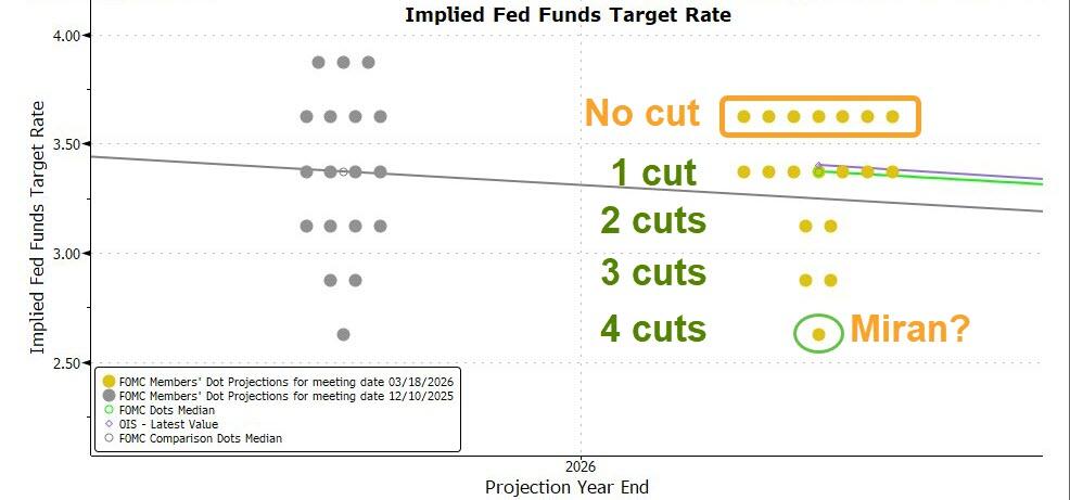 如市场所料,美联储继续按兵不动,除了特朗普去年“钦点”的联储理事米兰,其他投票委员都赞成暂停降息。联储决策者对降息依然谨慎,近两年的利率预期保持不变,本次特别指出,不确定中东局势对美国经济的影响。