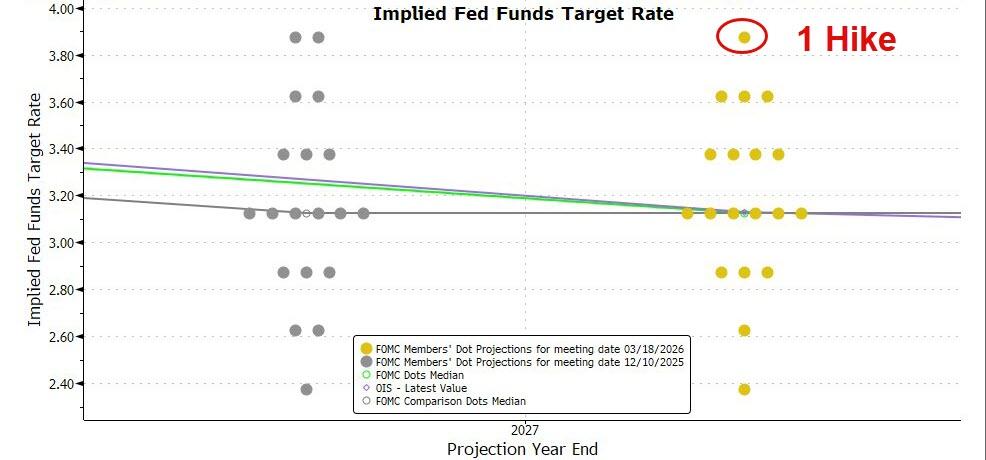 会后公布的点阵图显示,美联储决策层的近期利率路径预测和上一次去年12月公布点阵图时一致,依然预计今年、即2026年只会有一次25个基点的降息,明年也只降息一次。