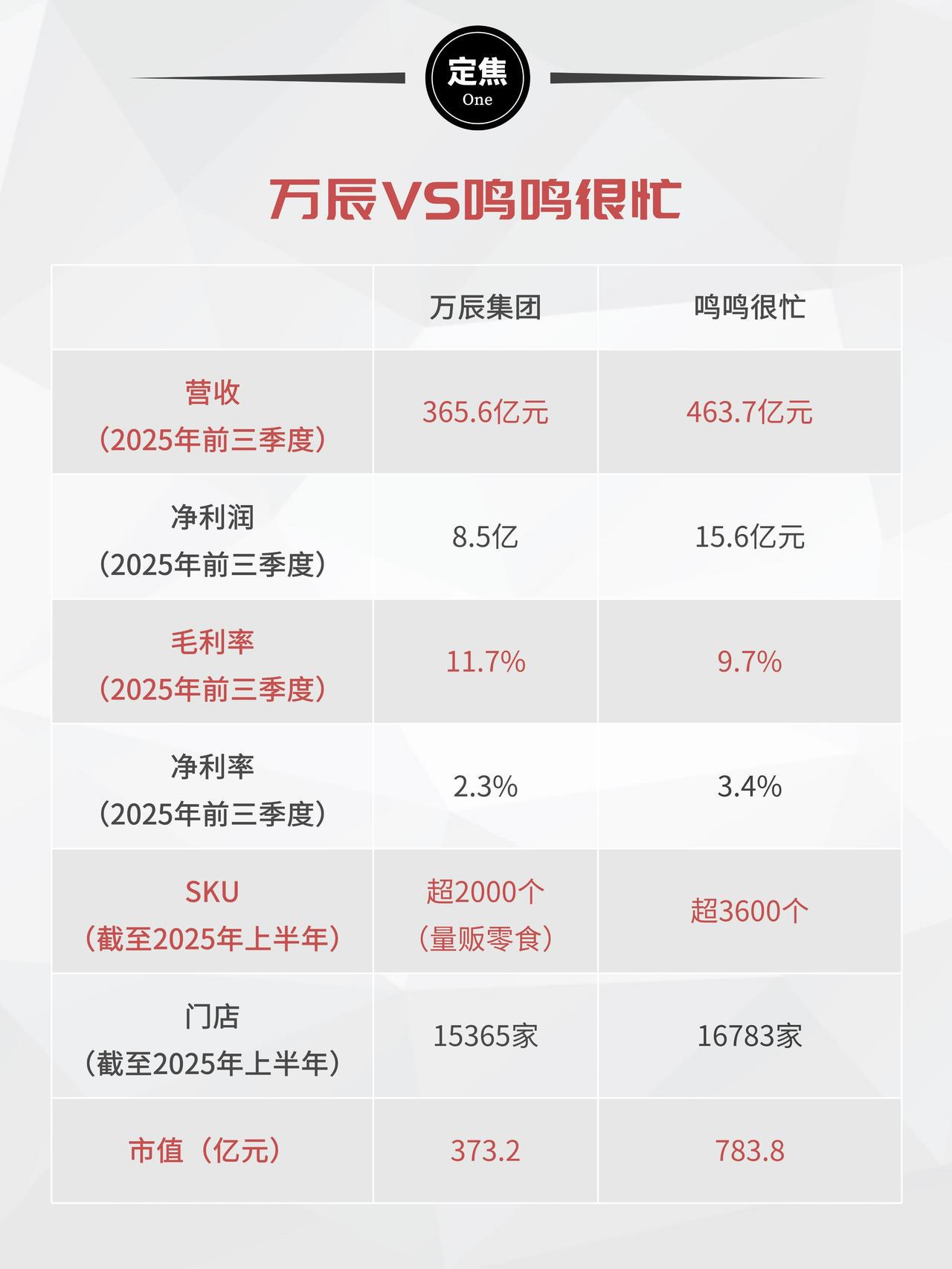 与同行鸣鸣很忙相比,2025年前三季度,万辰营收365.6亿元,低于鸣鸣很忙的463.7亿元,门店数量和SKU数量也暂时落后,但毛利率略胜一筹。截至发稿,鸣鸣很忙市值为783.8亿元,万辰为373.2亿元,两家差距较大,万辰还不足鸣鸣很忙一半。