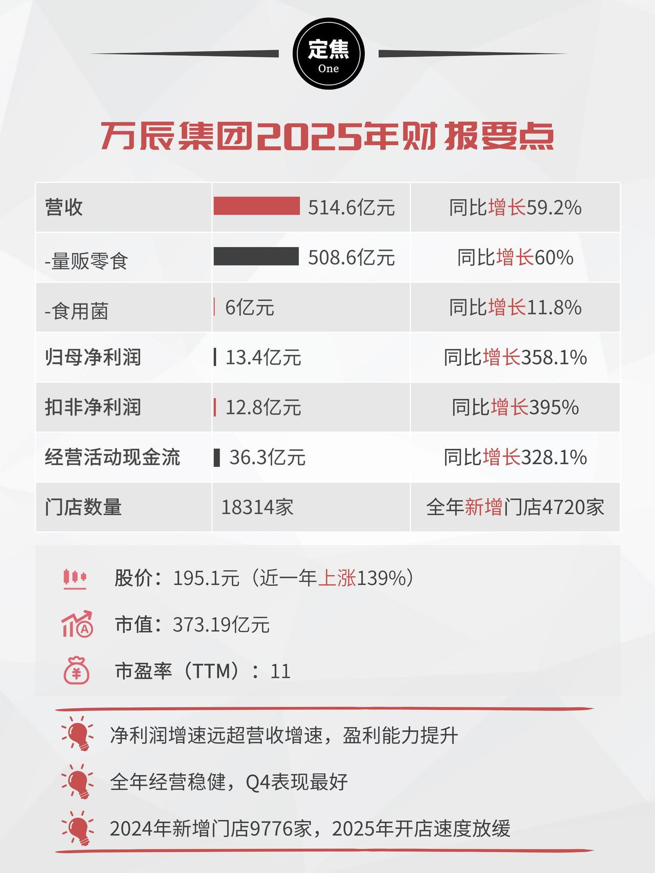 3月17日,万辰发布2025年业绩报告,总营收514.6亿元,同比增长59.2%;归母净利润13.4亿元,同比上涨358.1%;扣非净利润12.8亿元,同比提升395%。净利润增速远超营收增速,盈利能力大幅提升。