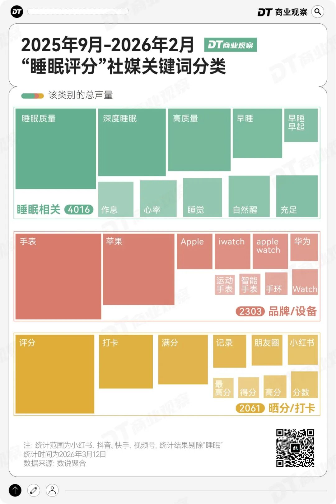 在“睡眠评分”社媒内容中,人们对睡眠本身的讨论占比最高,“睡眠质量”“深度睡眠”“高质量”等关键词反复出现,成为大家关注的核心。
