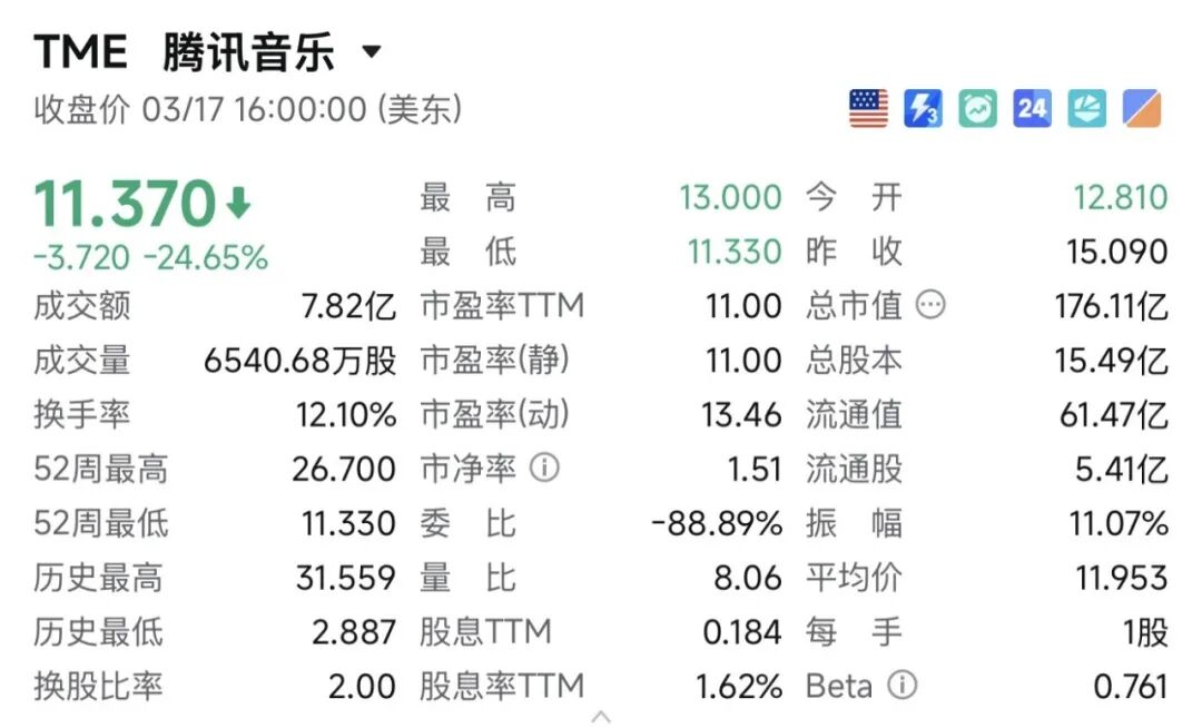 但市场给出的反馈却完全相反。财报发布当天,腾讯音乐的美股股价暴跌24.65%,总市值缩水了57.62亿美元,次日港股股价也跟着下跌21.82%,创下上市以来单日最大跌幅。
