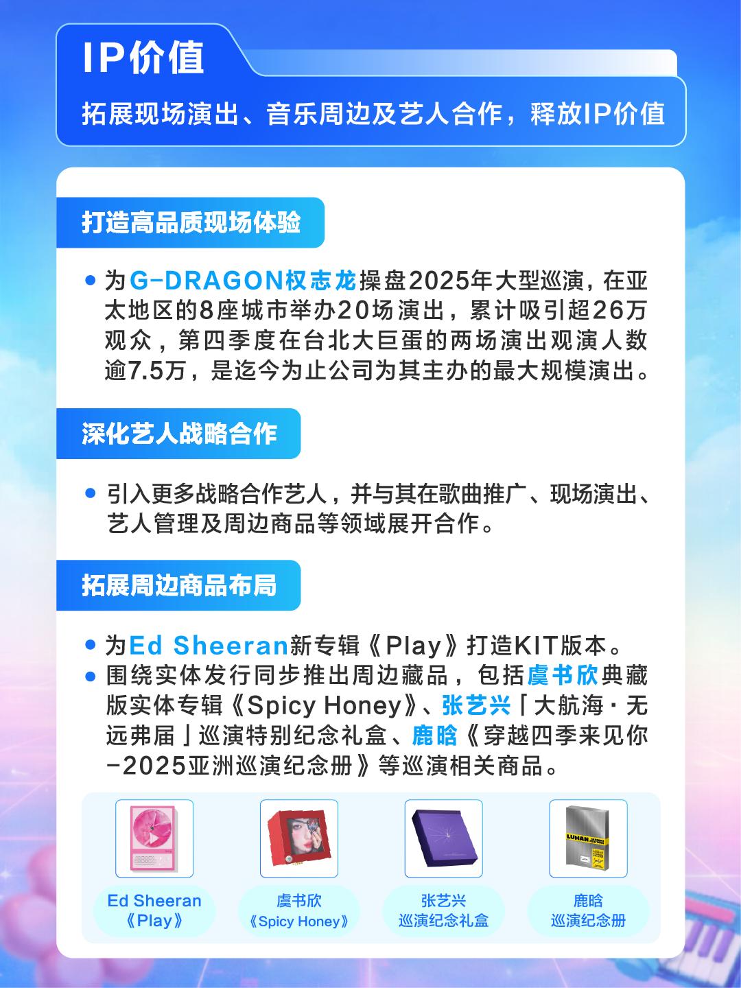 比如财报重点提到了IP价值相关的业务,操盘G-DRAGON 亚太巡演、引入更多战略合作艺人、与 Ed Sheeran 合作新专辑 KIT 版本、围绕多位头部艺人推出周边藏品,这些尝试都让腾讯音乐开始切入更上游的艺人服务与更线下的消费场景,把一首歌曲的单次播放价值拉长为演出、粉丝互动、商品收藏的全周期价值。
