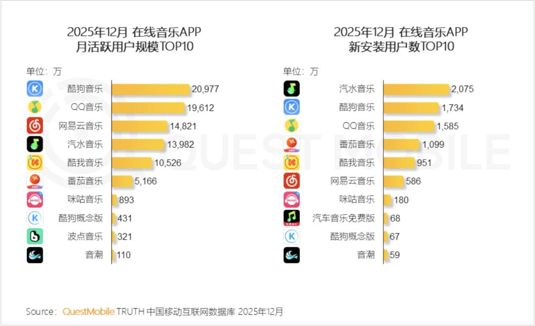 Questmobile最近发布的数据显示,截至2025年12月,汽水音乐以1.3982亿月活位居在线音乐APP月活TOP4,直逼网易云音乐,而同为字节系的番茄音乐以0.5166亿月活位居TOP6;同时,汽水音乐、番茄音乐还以2075万、1099万的新安装用户数,位居TOP 1和TOP 4。