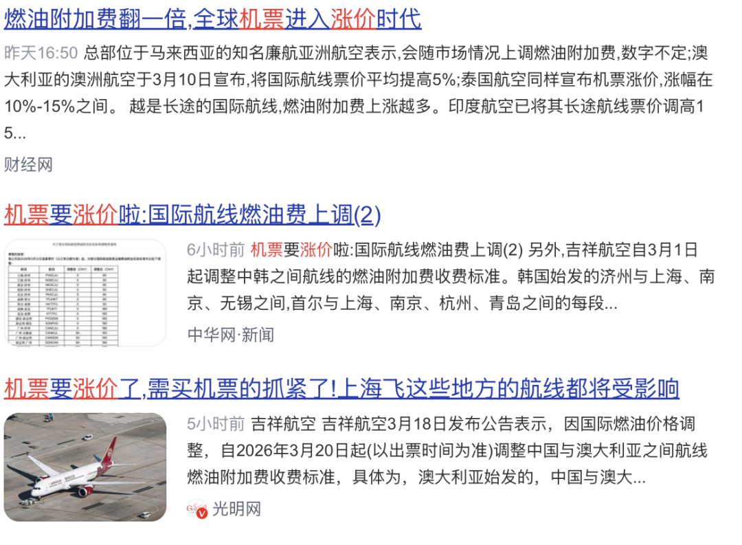 5.财经杂志,《燃油附加费翻一倍,全球机票进入涨价时代》,2026.03