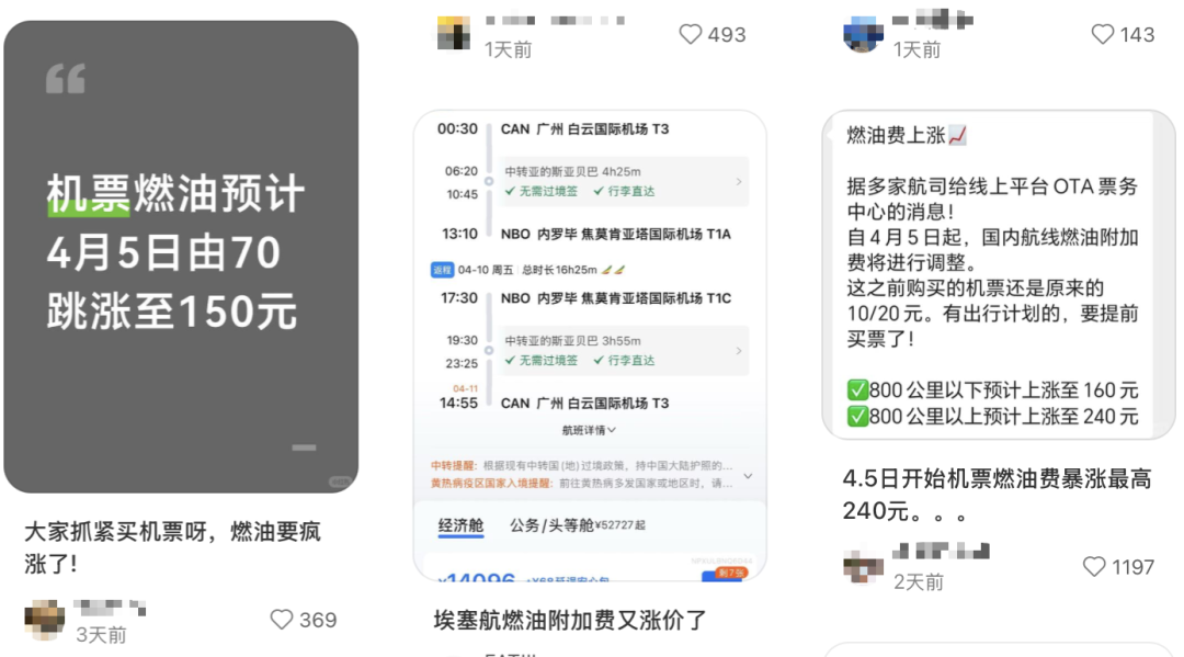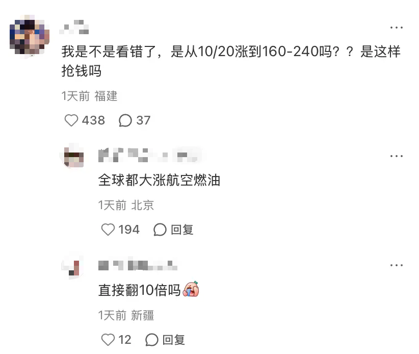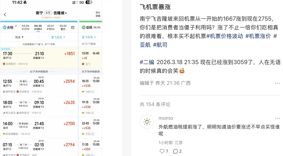 国内航司虽然嘴上没有明说,但算盘比谁打得都快。今天早晨,有网友发现,南航此前的泰国航线免燃油费,“现在已经跳到了200块”,澳洲航线的往返燃油费也从860元涨到了2400元。“国航也是,过了一晚上,燃油费默默涨了100块。”