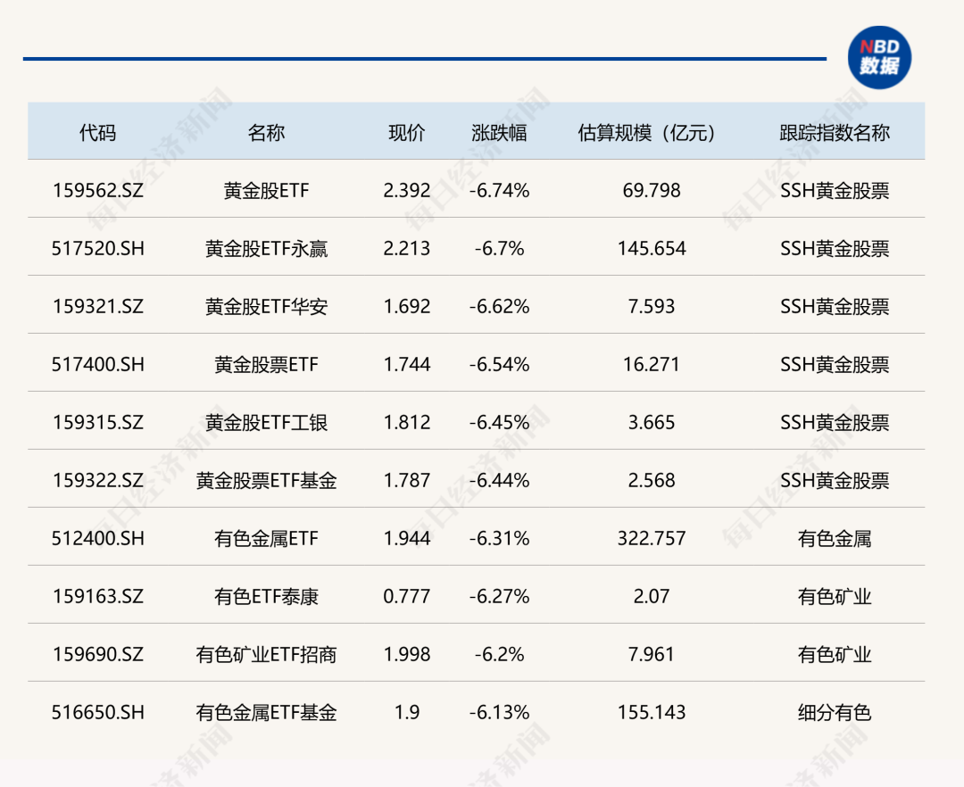 下跌方面,黄金股相关ETF跌超6%。