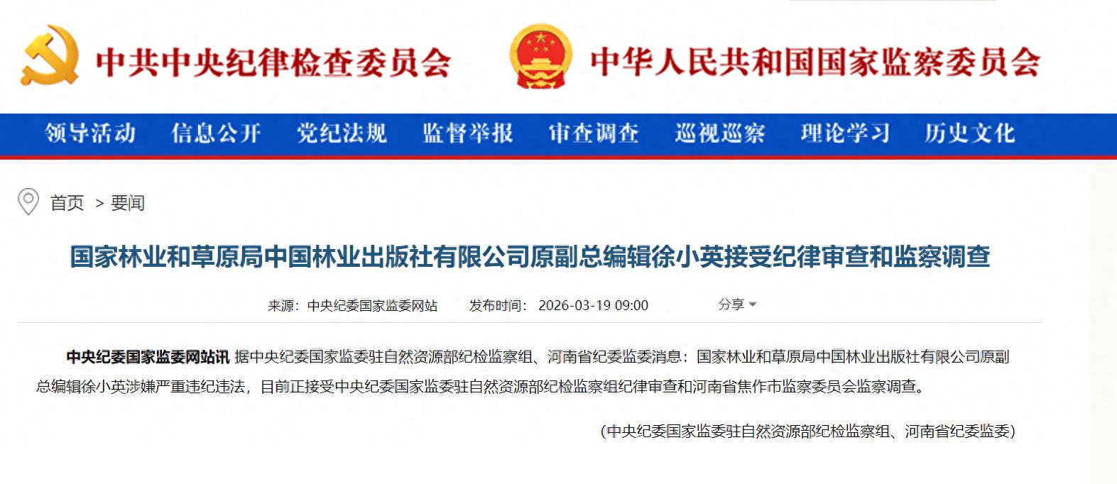 2026年3月19日,中央纪委国家监委网站发布通报,国家林业和草原局中国林业出版社有限公司原副总编辑徐小英涉嫌严重违纪违法,正接受中央纪委国家监委驻自然资源部纪检监察组纪律审查和河南省焦作市监察委员会监察调查,这一消息为林业系统廉政建设敲响了警钟。