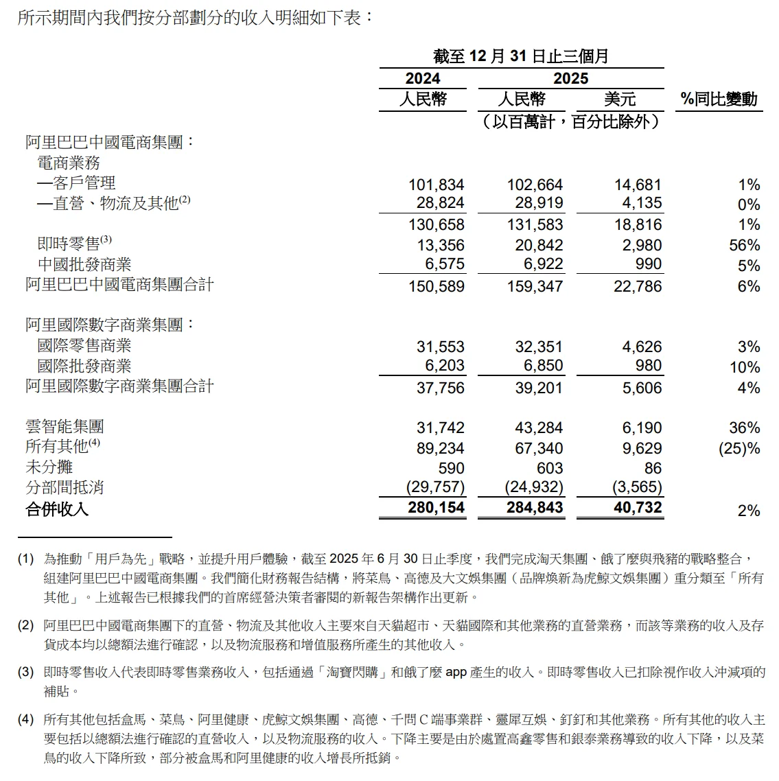 分业务看,中国电商集团本季度,持续扩大即时零售规模,单位经济效益稳步提升。“饿了么” 品牌焕新为 “淘宝闪购”,并于2026年1月接入千问APP,深化与淘宝生态联动。客户管理收入同比增长1% 至1026.64亿元。