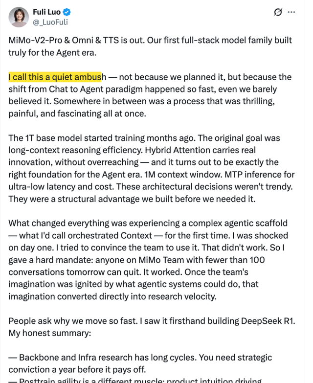 罗福莉解释,这并非是团队事先策划了“伏击”,而是从 Chat 到 Agent 的范式转变来得太快,快到连团队自己都有点难以置信。
