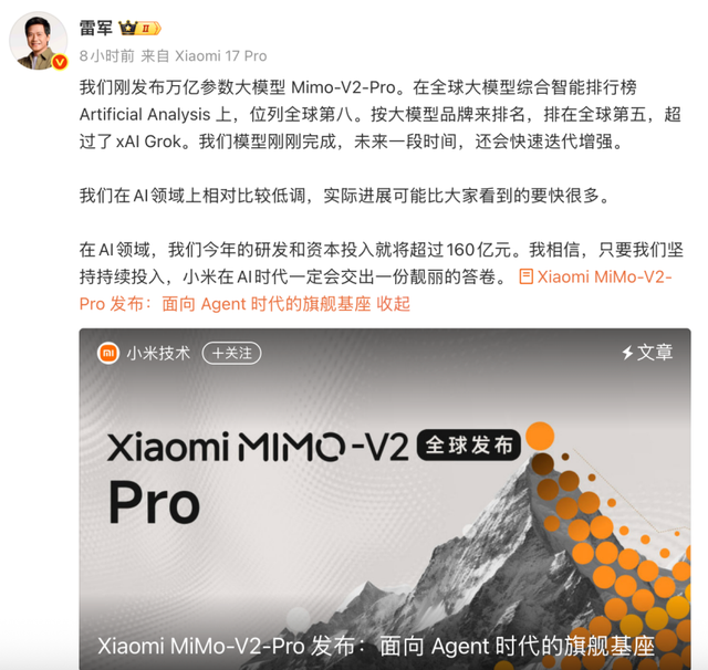 雷军发微博表示,Mimo-V2-Pro,在Artificial Analysis上位列全球第八,如果按照大模型品牌来看,位列全球第五,超过了xAI的Grok。