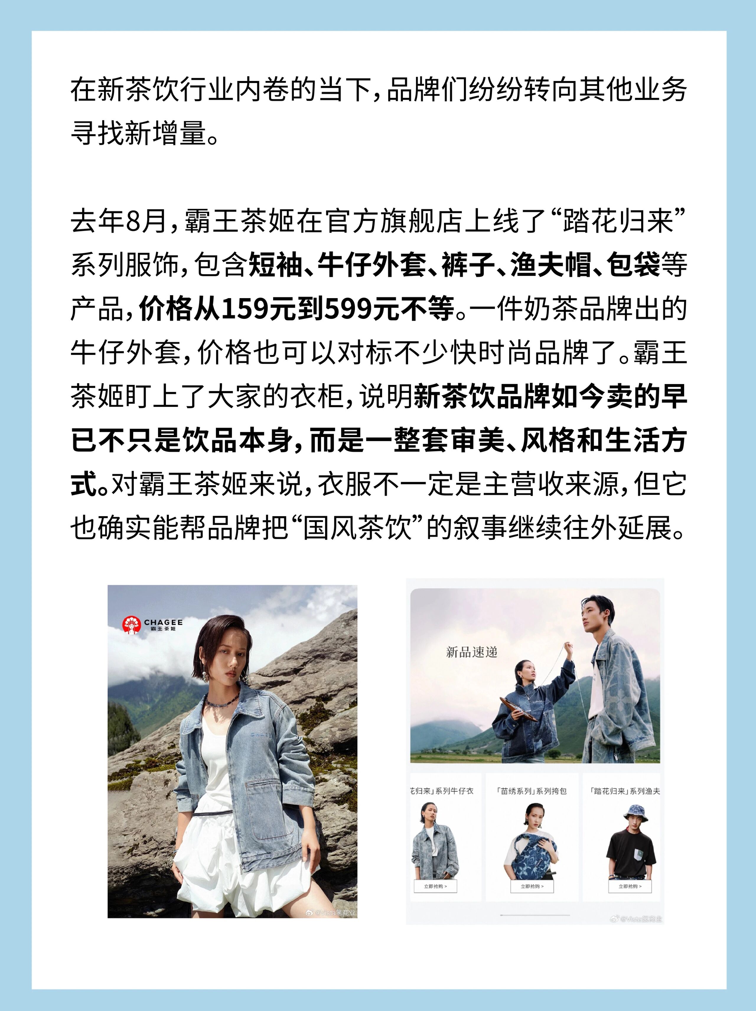 在新茶饮品牌内卷的当下,品牌们纷纷转向其他业务寻找新增量。去年8月,霸王茶姬在官方旗舰店上线了“踏花归来”系列服饰,包含短袖、牛仔外套、裤子、渔夫帽、包袋等产品,价格从159元到599元不等。一件奶茶品牌出的牛仔外套,价格也可以对标不少快时尚品牌了。霸王茶姬盯上了大家的衣柜,说明新茶饮品牌如今卖的早已不只是饮品本身,而是一整套审美、风格和生活方式。对霸王茶姬来说,衣服不一定是主营收来源,但它也确实能帮品牌把“国风茶饮”的叙事继续往外延展。