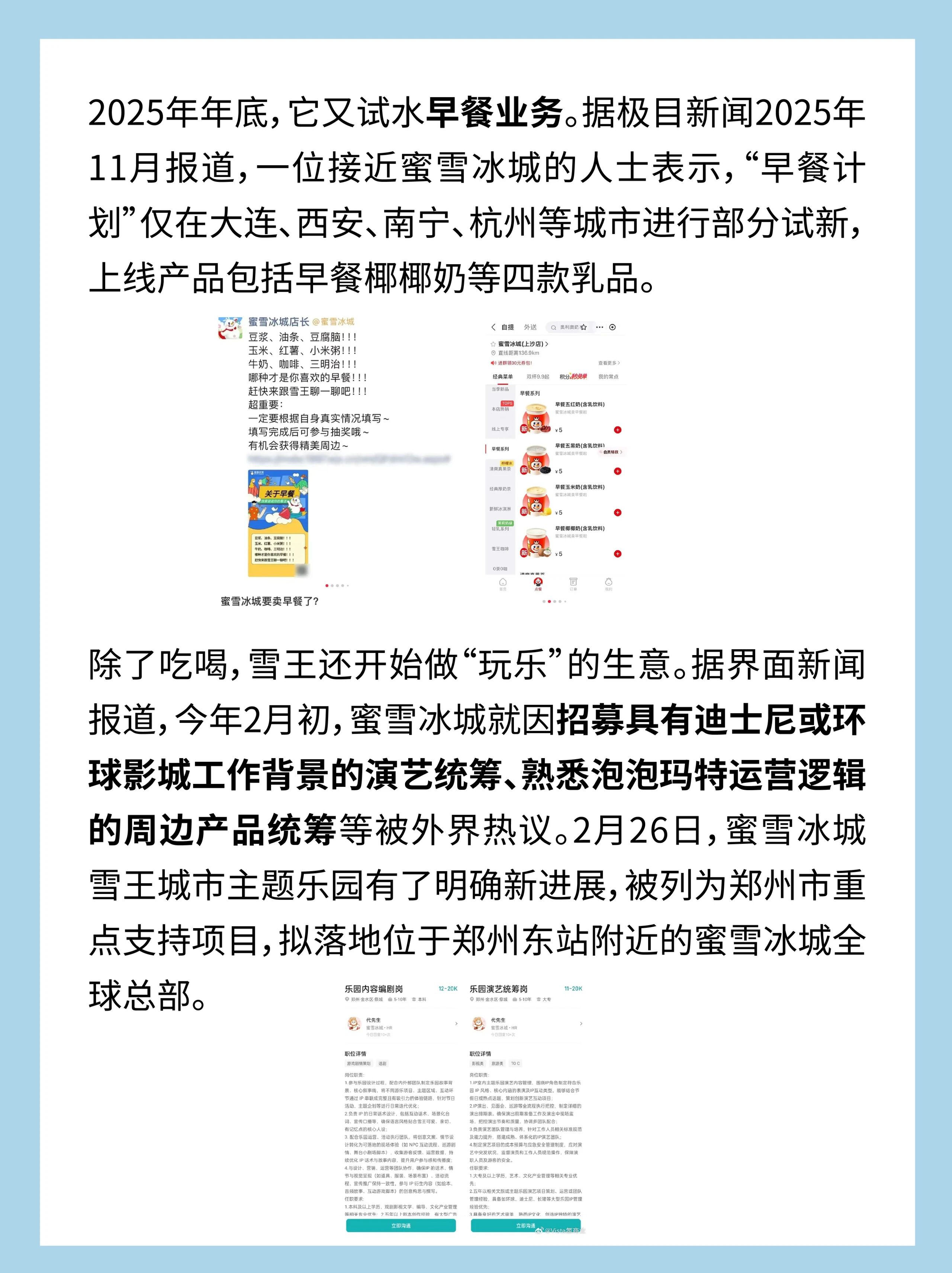 除了吃喝,雪王还开始做“玩乐”的生意。据界面新闻报道,今年2月初,蜜雪冰城就因招募具有迪士尼或环球影城工作背景的演艺统筹、熟悉泡泡玛特运营逻辑的周边产品统筹等被外界热议。2月26日,蜜雪冰城雪王城市主题乐园有了明确新进展,被列为郑州市重点支持项目,拟落地位于郑州东站附近的蜜雪冰城全球总部。