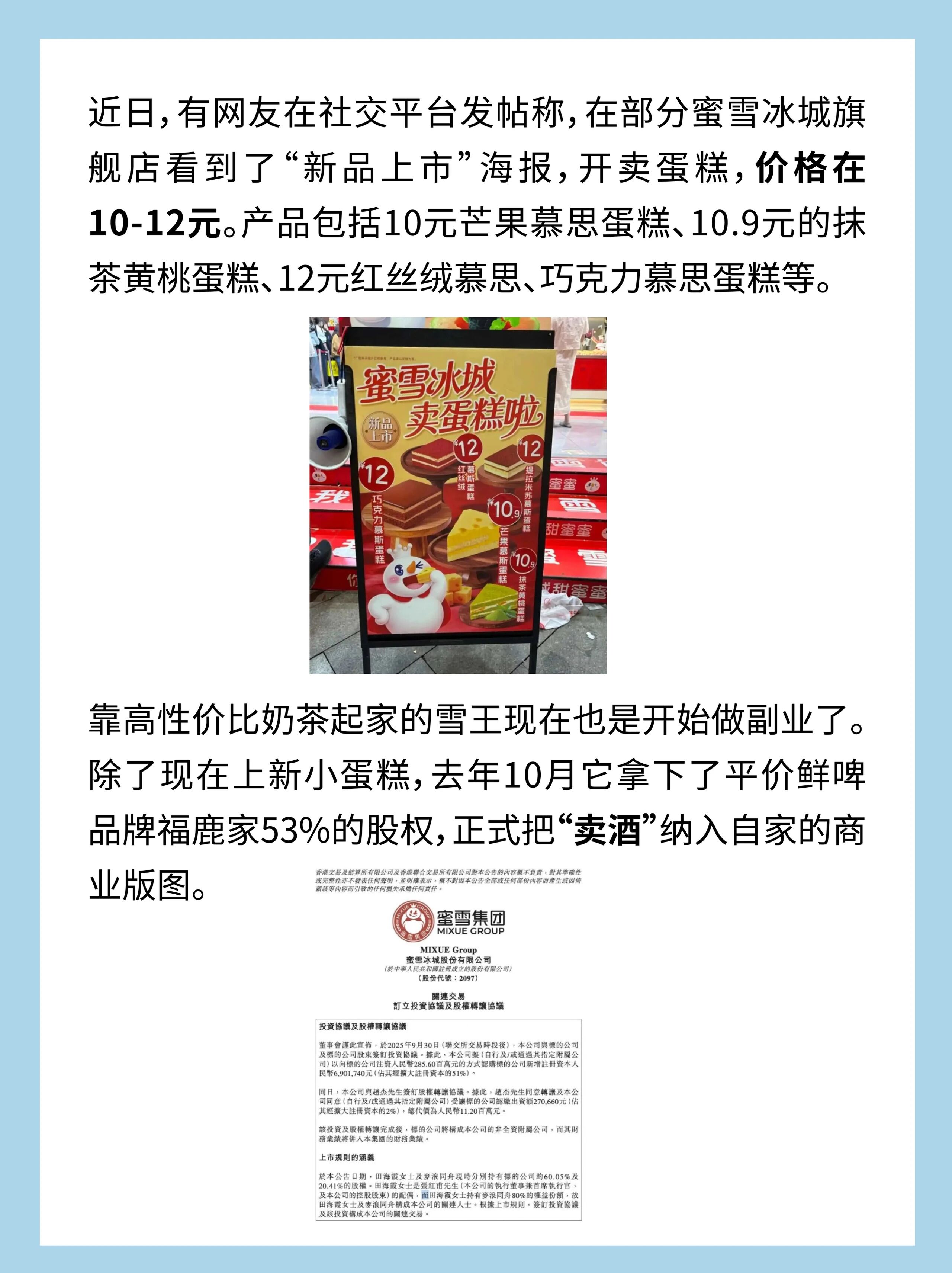 靠高性价比奶茶起家的雪王现在也是开始做副业了。除了现在上新小蛋糕,去年10月它还拿下了平价鲜啤品牌福鹿家53%的股权,正式把“卖酒”纳入自家的商业版图。2025年年底,它又试水早餐业务。据极目新闻2025年11月报道,一位接近蜜雪冰城的人士表示,“早餐计划”仅在大连、西安、南宁、杭州等城市进行部分试新,上线产品包括早餐椰椰奶等四款乳品。