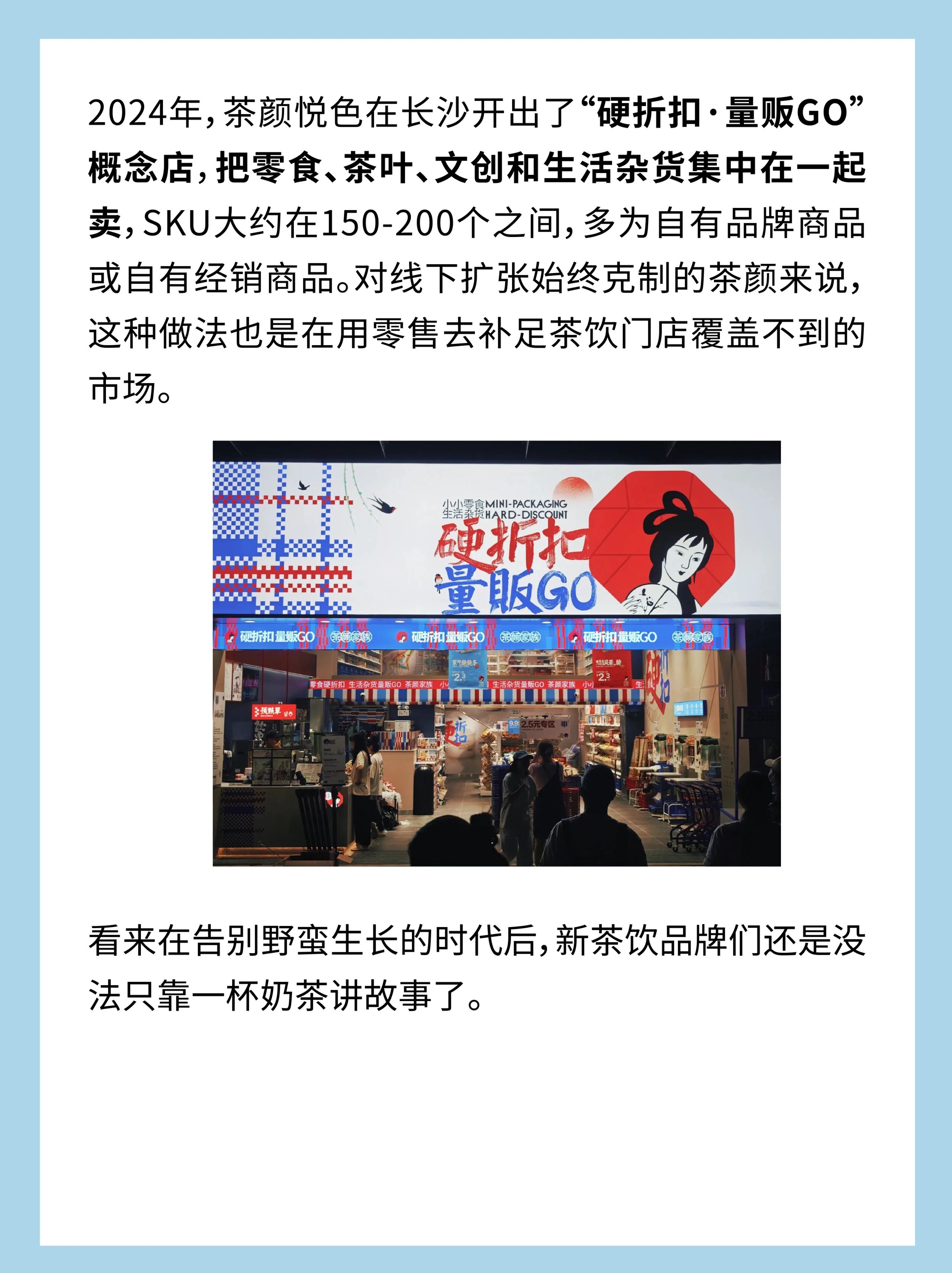 2024年,茶颜悦色在长沙开出了“硬折扣·量贩GO”概念店,定位为零食生活杂货店,把零食、茶叶、文创和生活杂货集中在一起卖,SKU大约在150-200个之间,多为自有品牌商品或自有经销商品。对线下扩张始终克制的茶颜来说,这种做法也是在用零售去补足茶饮门店覆盖不到的市场。