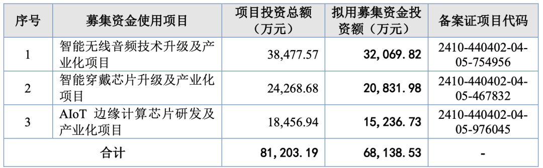 本次冲击上市,杰理科技拟募集资金约6.81亿元,扣除发行费用后,拟投资于智能无线音频技术升级及产业化项目、智能穿戴芯片升级及产业化项目、AIoT边缘计算芯片研发及产业化项目。