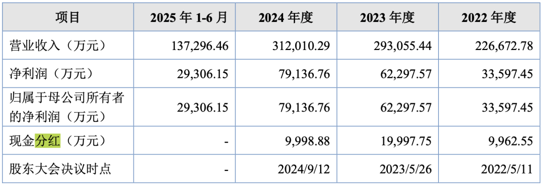2022年—2024年及2025年1—6月(下称“报告期”),公司实现营业收入226672.78万元、293055.44万元、312010.29万元和137296.46万元,净利润33597.45万元、62297.57万元、79136.76万元和29306.15万元,最新一期公司业绩较往年同期出现下滑。