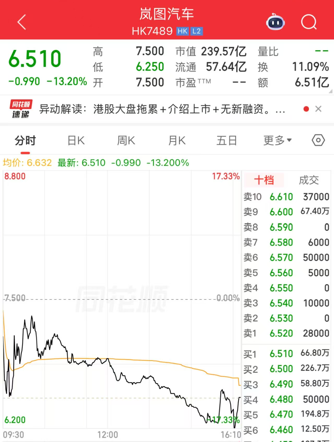 当日开盘价7.5港元 ,最终以 6.51港元收盘 , 单日跌幅达13.2% , 收盘总市值239.57亿港元 。
