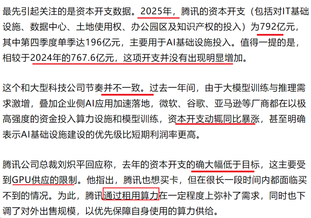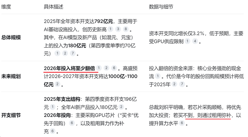根据腾讯控股刚刚发布的2025年财报及业绩会信息,管理层对AI开支的描述非常清晰,核心要点是2026年AI相关投入将至少翻倍,且资本开支优先用于算力基础设施建设。