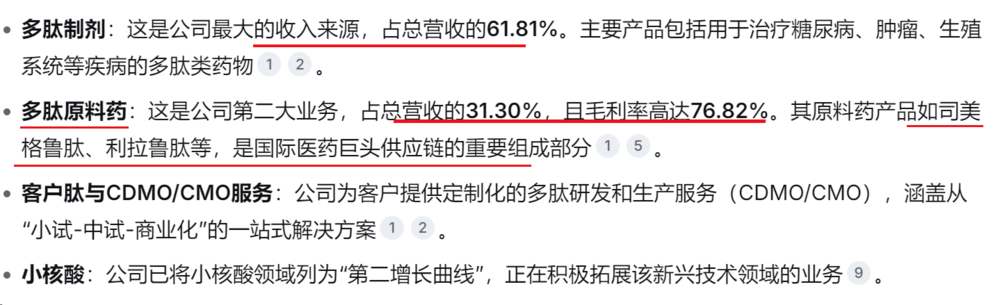 翰宇药业的核心业务聚焦于多肽药物领域,围绕这一核心构建了多元化的业务模式。根据其主营构成,主要业务可以分为以下几个板块: