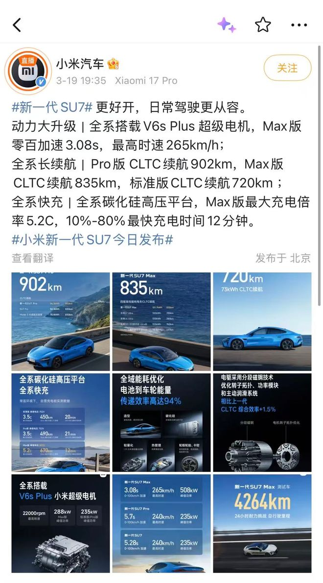 3月19日,小米春季新品发布会正在进行中。发布会上正式发布新一代SU7,起售价21.99万元,在智能驾驶、动力性能与底盘技术三大维度全面升级。