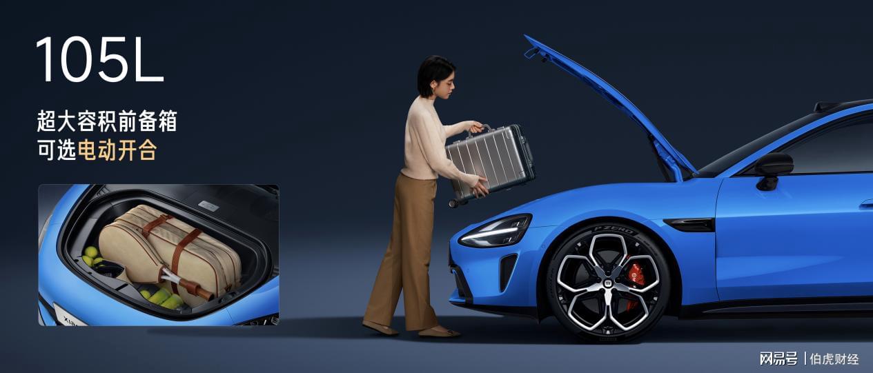 全系标配Ultra同款电动前备箱,支持8种开合方式,容积达105L,可容纳20英寸登机箱。开启方式包括车外实体按键、中控大屏、小米汽车APP、小米汽车APP小部件、遥控钥匙、UWB近场控车、车内小爱语音、车外小爱语音。
