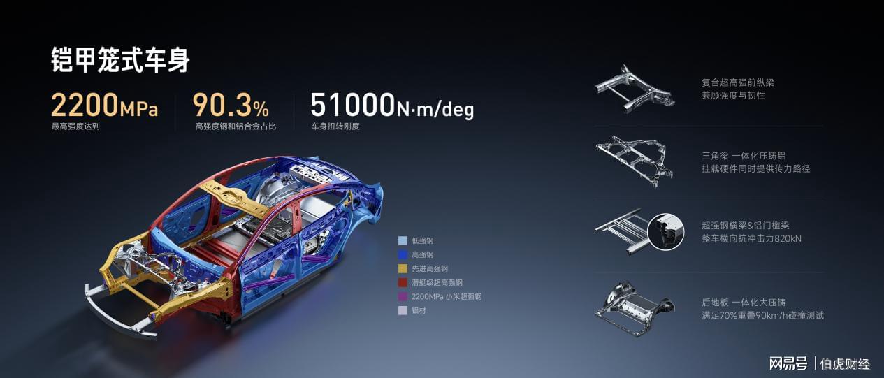 对小米汽车来说,安全始终是一切体验的前提与基础。新一代SU7依然采用行业最高标准打造,延续C-NCAP五星、C-IASI G+安全标准,通过全工况、全席位女性假人碰撞测试,测试覆盖范围及严苛程度均超出C-NCAP与C-IASI标准。全系标配2200MPa小米超强钢,为行业唯二实现量产的超高强度材料,整车高强度钢与铝合金占比达90.3%,显著提升车身结构安全性。