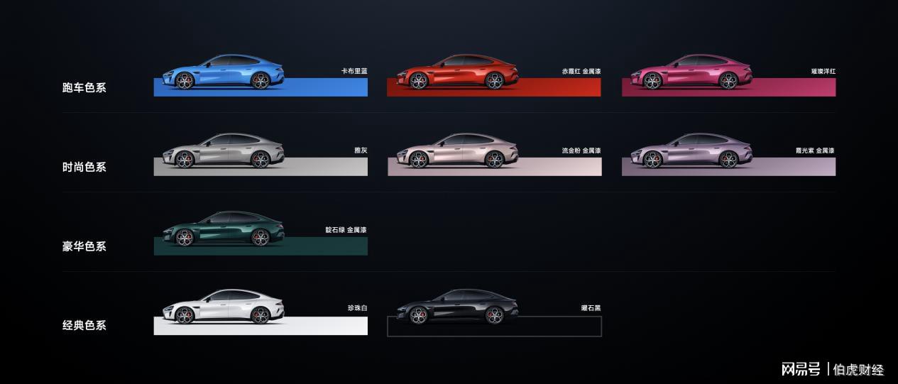 首先,在车色方面,新一代小米SU7依旧推出9款颜色,不仅保留了第一代SU7非常受欢迎的四款颜色:雅灰、珍珠白、璀璨洋红、霞光紫,同时延续了两款其他车系的好评色:来自Ultra的曜石黑、来自YU7的流金粉,除此之外,本次新SU7首发三款新颜色,分别是:卡布里蓝、赤霞红和靛石绿。