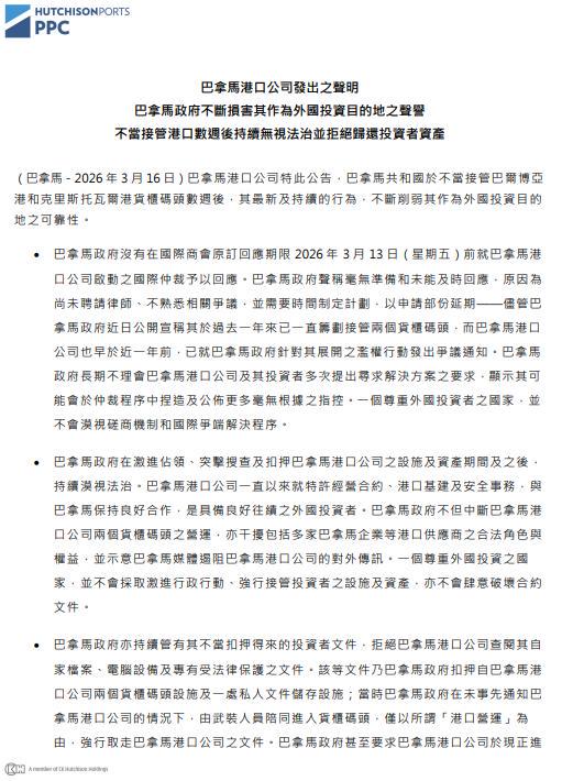 面对巴方的违规操作,长和迅速启动法律维权。3月6日,PPC依据国际商会仲裁规则,对巴拿马政府启动国际仲裁,索赔至少20亿美元,强调此举并非象征性补偿,而是全数追索因巴方严重违约造成的损失。