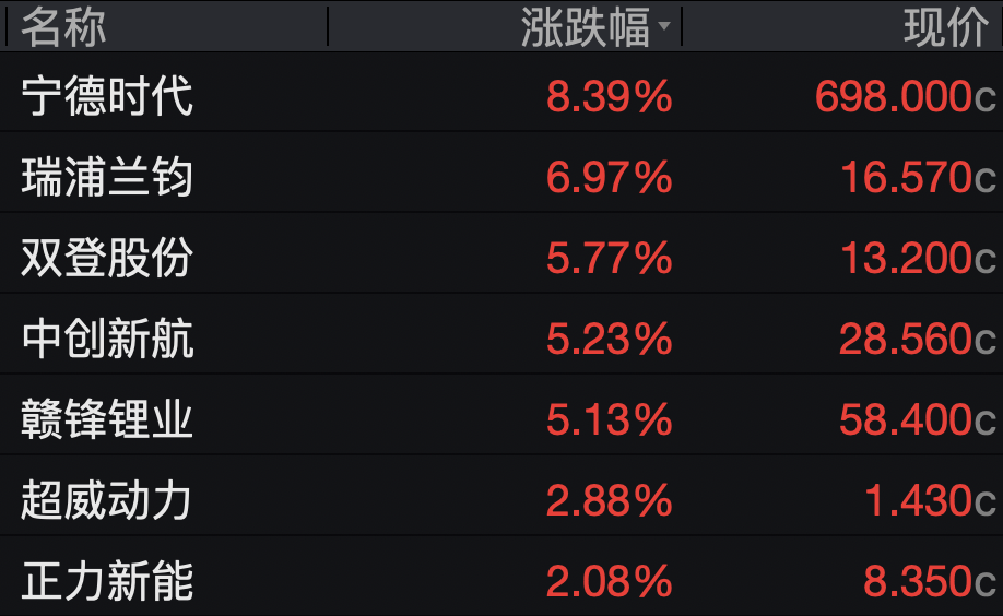 锂电池板块逆势走高,宁德时代涨超8%,双登股份、中创新航、赣锋锂业涨超5%。