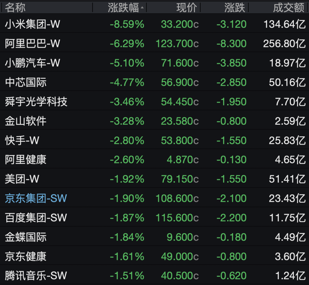 科网股下挫,小米集团跌逾8%,小鹏汽车跌逾5%,快手、美团、京东均走低。