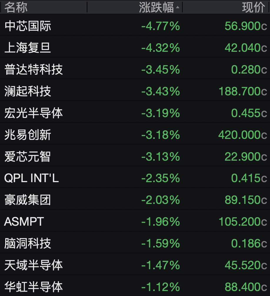 半导体、芯片股走低,中芯国际、上海复旦跌超4%,兆易创新跌超3%,华虹半导体、天域半导体跌超1%。