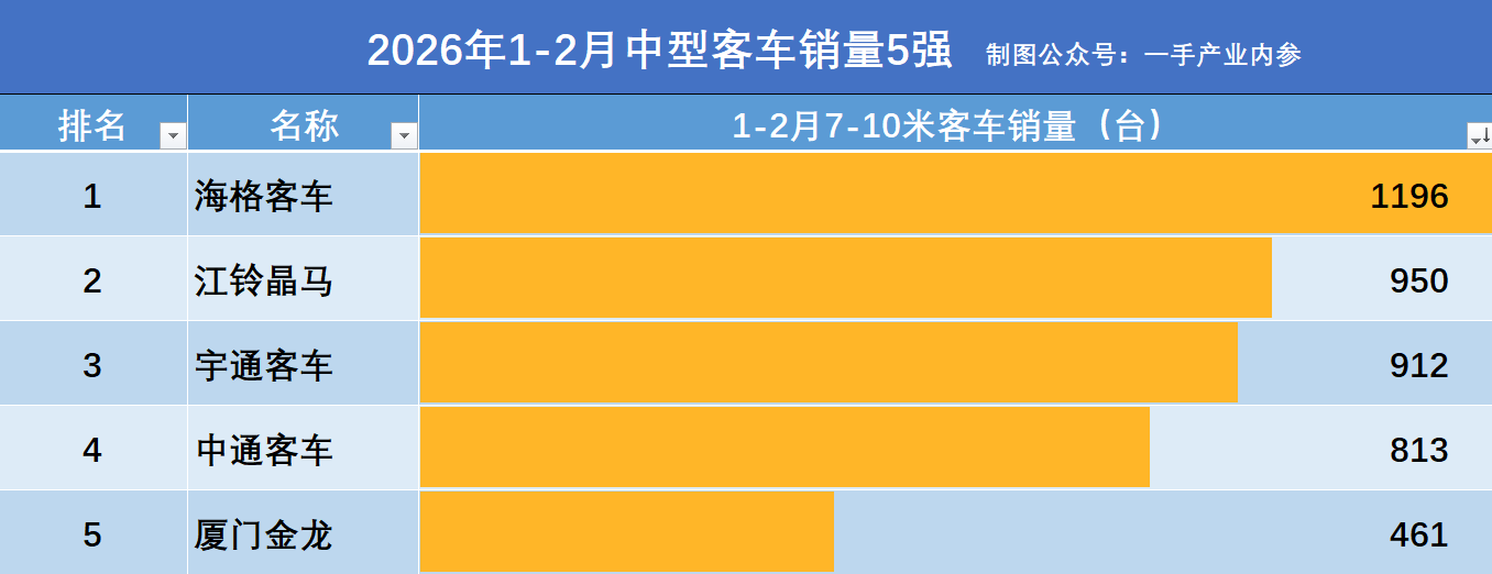 另附:2026年1-2月中型客车(7-10米)销量5强厂商名单,数据源于:中国客车网。