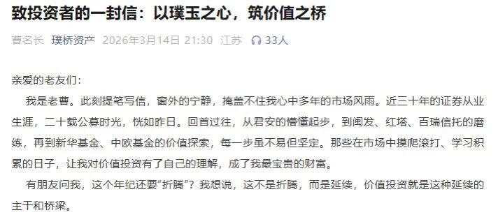 3月14日,曹名长在璞桥资产公众号发布首篇文章称,“近三十年的证券从业生涯,二十载公募时光,恍如昨日。”正是经历了多家资管机构的历练,以及在新华基金、中欧基金的探索,让他对价值投资有了自己的理解,并视之为最宝贵的财富。