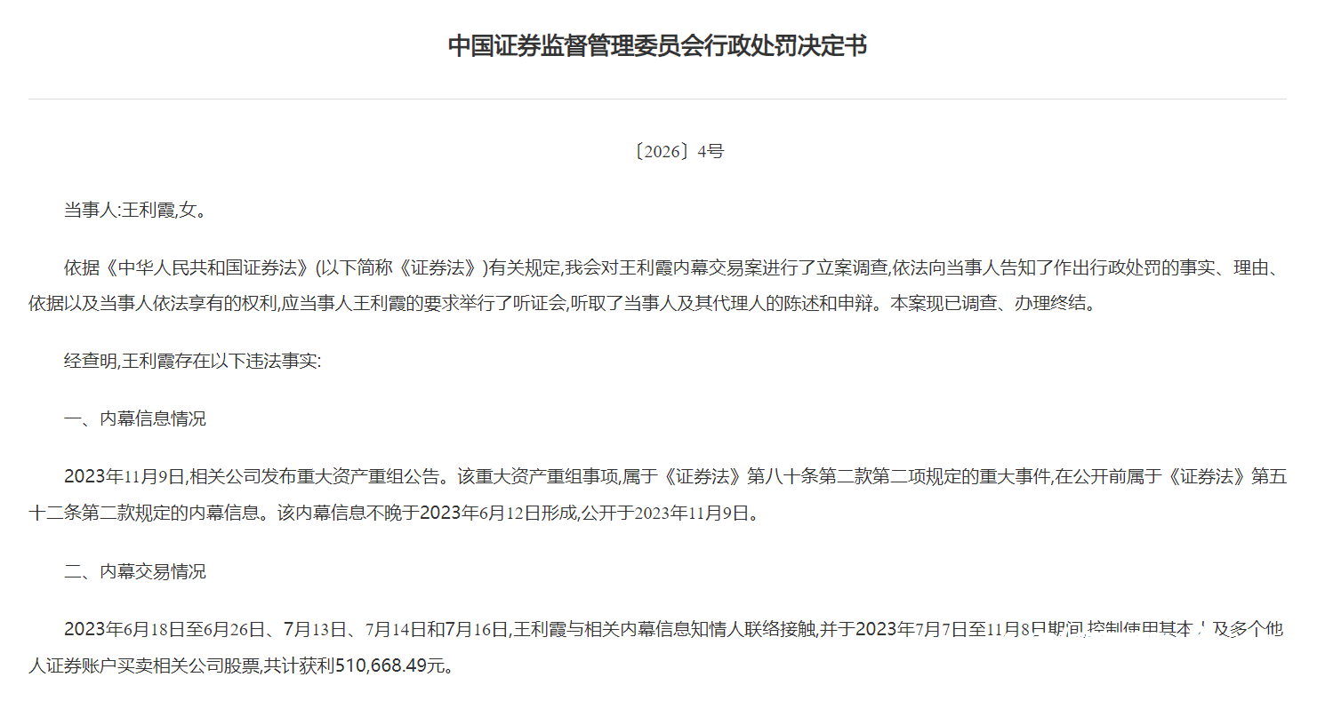 3月20日,证监会发布一则行政处罚决定书指向了内幕交易案。据查,自然人王利霞存在两项违法事实: