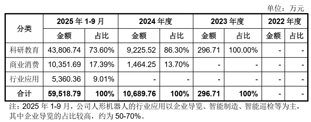 宇树在第二轮预先审阅问询函的回复中也提及,2025年1-9月,公司人形机器人开始在行业领域应用,收入占比仅为9.01%,以企业导览、智能制造、智能巡检等为主,其中企业导览的占比较高,约为50%-70%。