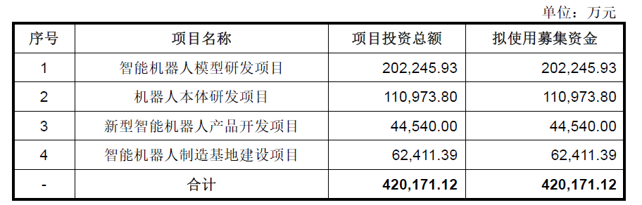 根据招股书申报稿,宇树科技此次IPO拟募资42.02亿元,募集资金计划用于智能机器人模型研发、机器人本体研发、新型智能机器人产品开发及智能机器人制造基地建设四大项目。