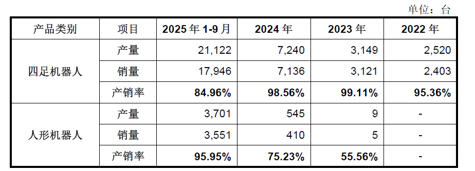 宇树科技表示,四足机器人方面,报告期前三年产销率整体处于较高水平,2025年1-9月四足机器人产销率有所下降,主要系公司与京东自营于2024年末开始合作,主要对其销售消费级四足机器人,交易模式为先发货后结算,并于结算后确认收入。截至2025年9月末,公司位于京东自营仓库的发出商品数量较多,导致产销率出现暂时性下降。