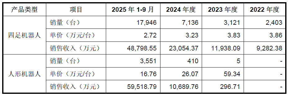 宇树的四足机器人以及人形机器人的产销量以及收入情况