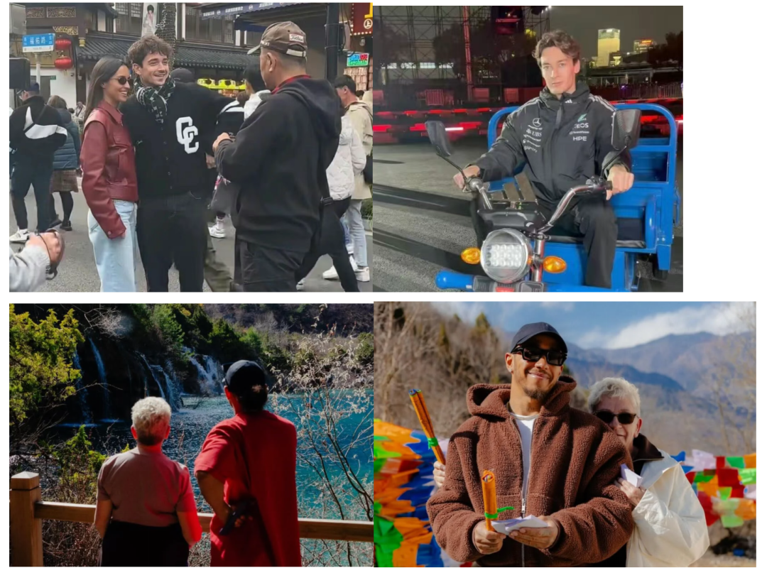 勒克莱尔在豫园被上海老法师拦下拍照,用毛笔写马字;拉塞尔在外滩学中文说我爱上海,开三轮车拍广告;汉密尔顿甚至带着妈妈去了九寨沟旅游。在社交媒体上,他们不再是遥不可及的六冠王,而是逛超市会被偶遇的“沪上打卡特种兵”。